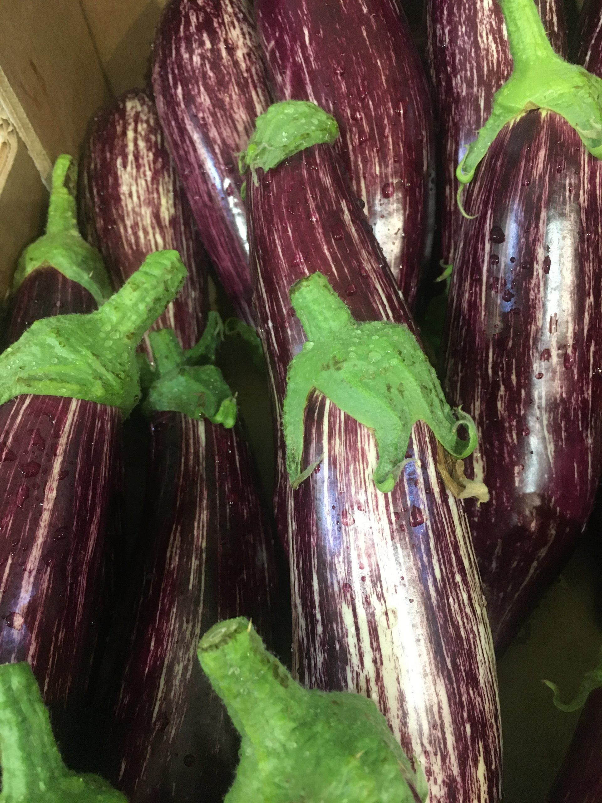 Melanzane striate dalla polpa dolce e compatta, provenienza Sicila o Lazio.