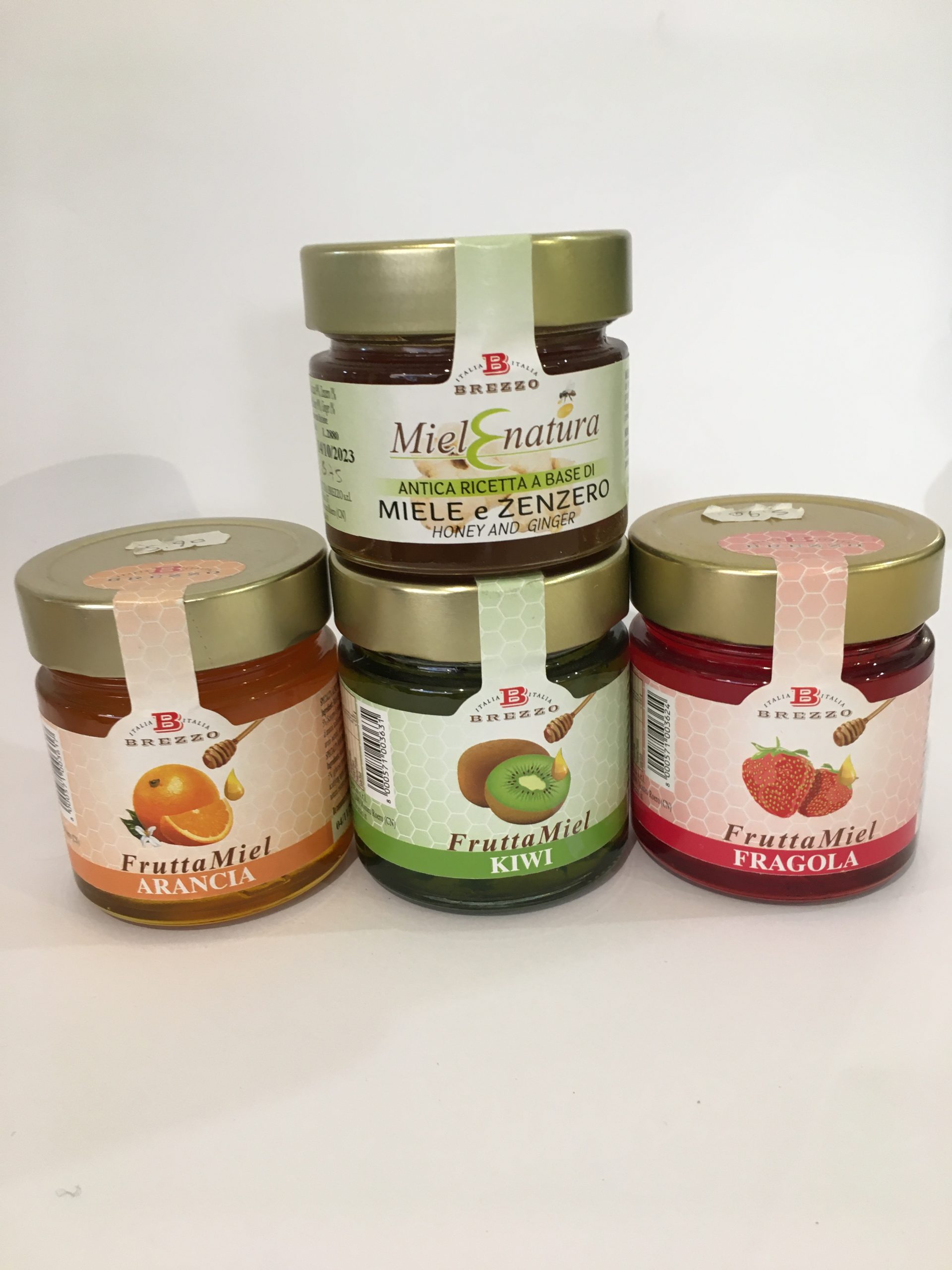 Mieli alla frutta, tutti naturali con frutta fresca, ottimi per la prima colazione: alla fragola, al kiwi , all’arancia, allo zenzero.