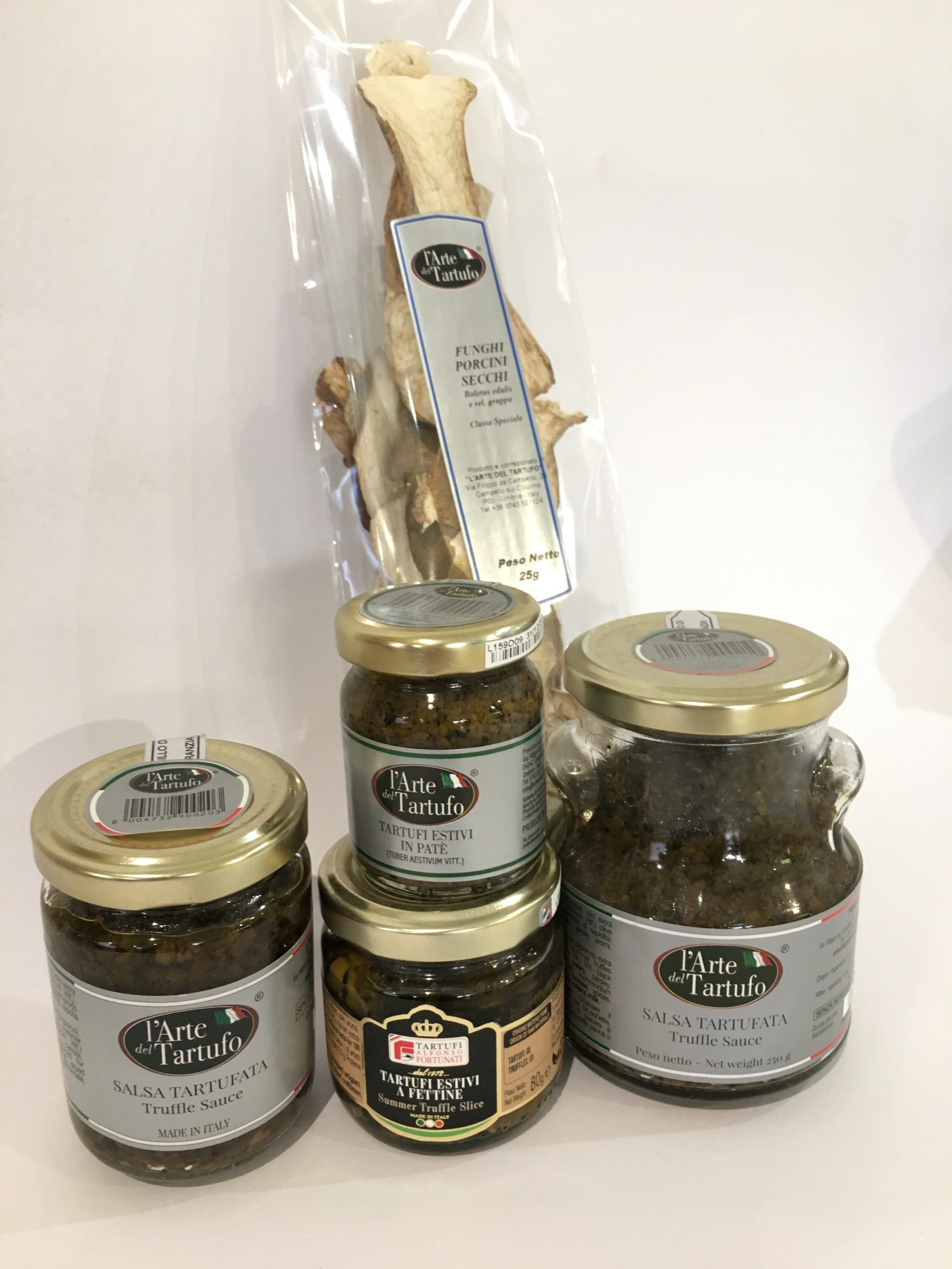 Tartufi conservati in vasetto: salsa tartufata, tartufi estivi in paté, tartufi estivi in lamelle, porcini secchi.